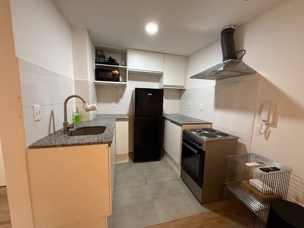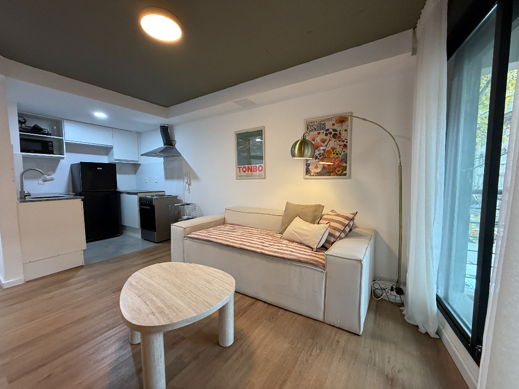 Apartamento al frente, equipado con muebles y linea blanca Un dormitorio con placard, living comedor, cocina, baño y balcones al frente. Salto y Constituyente a pasos de la IMM y próximo a facultades.